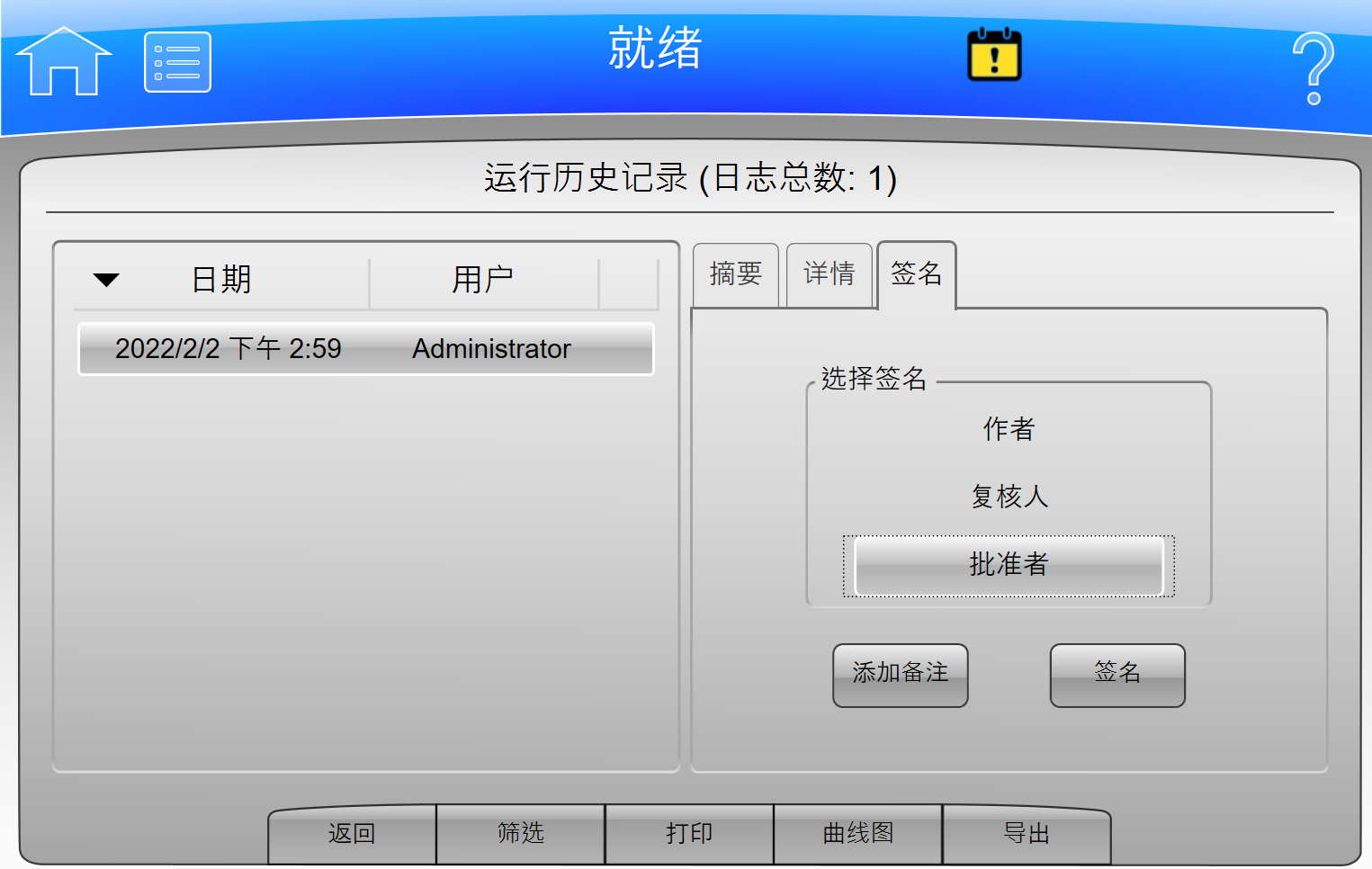 5. 添加电子签名(及添加备注)- 选择“签名”,系统进入“签名”界面,输入密码并选择OK,系统会将电子签名添加到“运行历史”页面的“摘要”中。